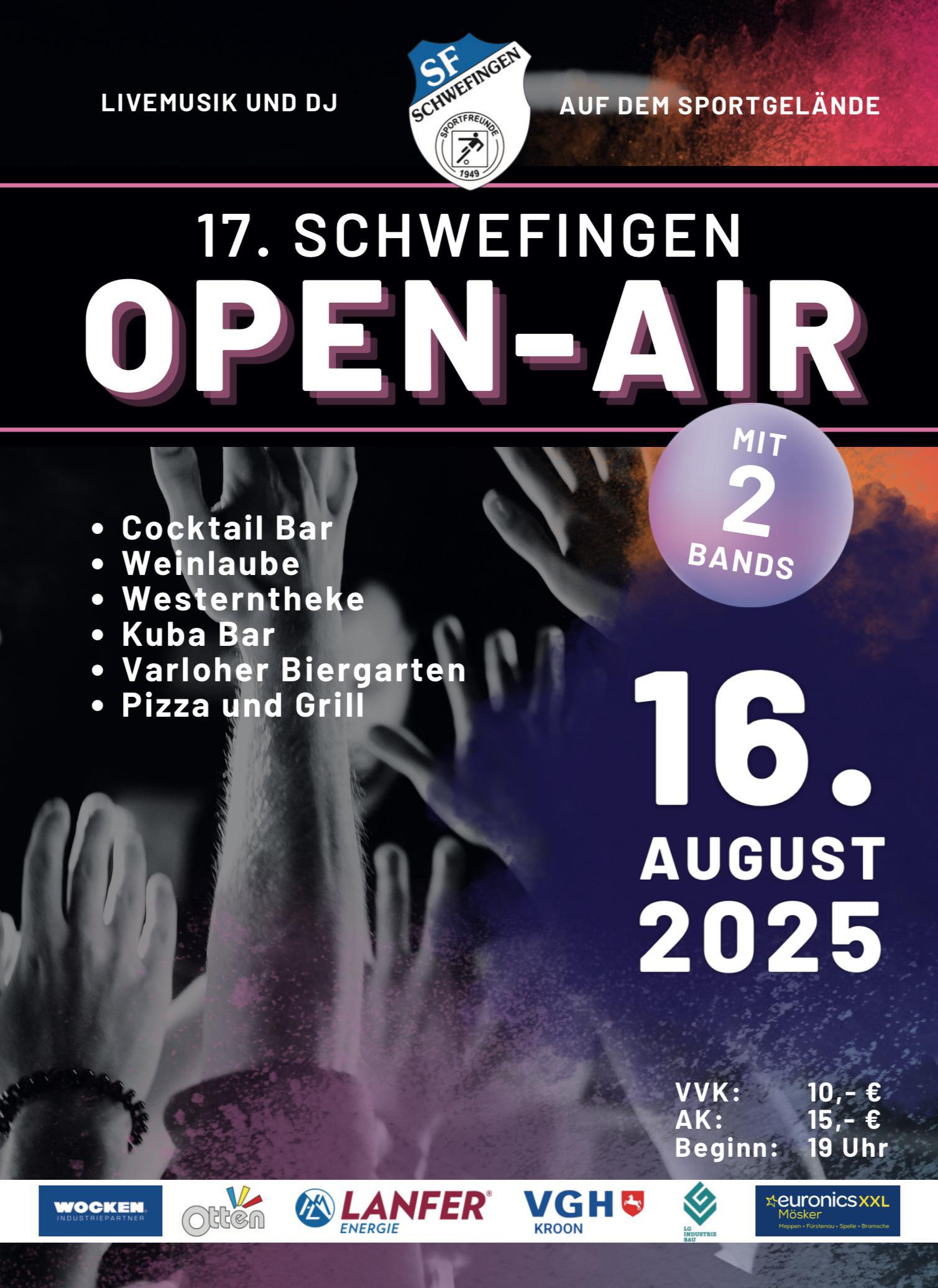 Nach einem Jahr Pause findet in diesem Sommer wieder das beliebte Schwefingen Open Air statt. Am 16. Augustverwandelt sich das Sportgelände der Sportfreunde Schwefingen erneut in ein lebendiges Festivalgelände und lädt Besucherinnen und Besucher aus der Region zu einem abwechslungsreichen Abend mit Musik, Kulinarik und guter Stimmung ein.